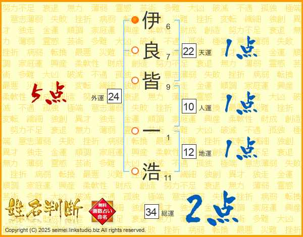 伊(6画)良(7画)皆(9画) 一(1画)浩(11画)