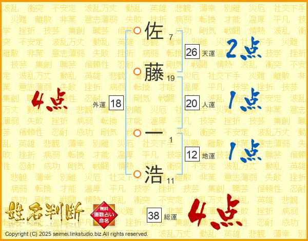 佐(7画)藤(19画) 一(1画)浩(11画)