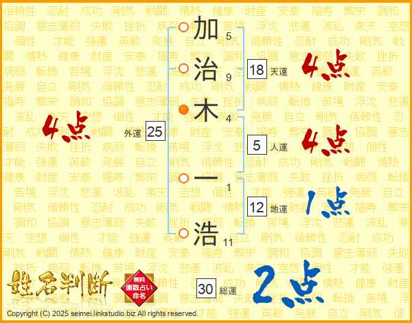 加(5画)治(9画)木(4画) 一(1画)浩(11画)