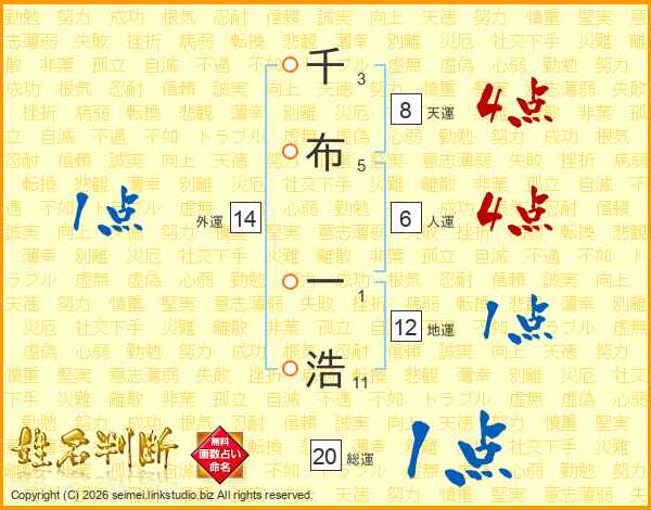 あなたの人生を表す1番重要な運勢です。生涯を通じて影響する総合運となり、主に50歳以降の晩年期に影響を及ぼします。苗字と名前の合計画数。