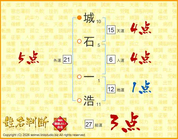 城(10画)石(5画) 一(1画)浩(11画)