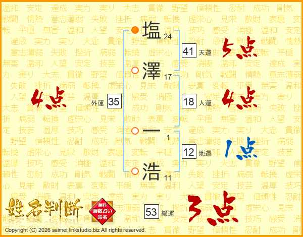 塩(24画)澤(17画) 一(1画)浩(11画)