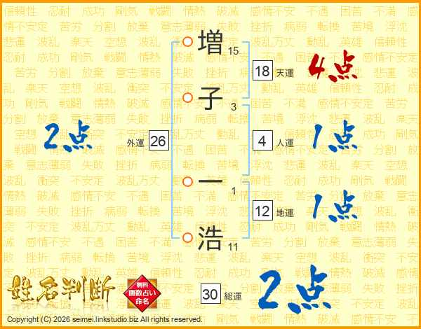 あなたの人生を表す1番重要な運勢です。生涯を通じて影響する総合運となり、主に50歳以降の晩年期に影響を及ぼします。苗字と名前の合計画数。