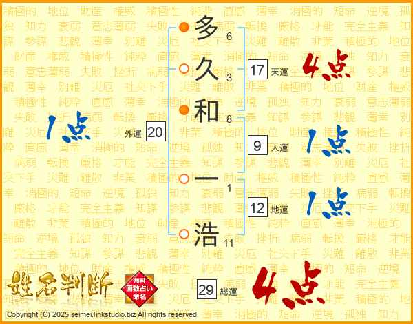 多(6画)久(3画)和(8画) 一(1画)浩(11画)