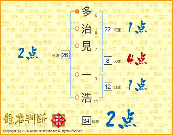 多(6画)治(9画)見(7画) 一(1画)浩(11画)