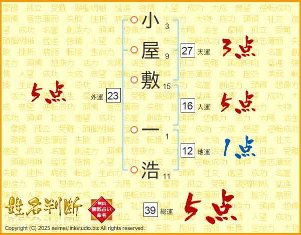 小(3画)屋(9画)敷(15画) 一(1画)浩(11画)