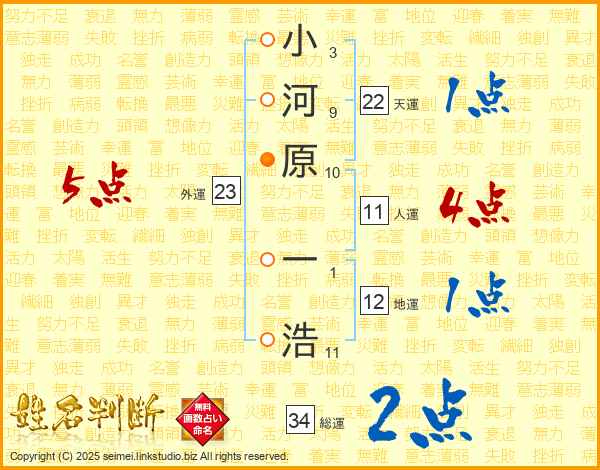 小(3画)河(9画)原(10画) 一(1画)浩(11画)