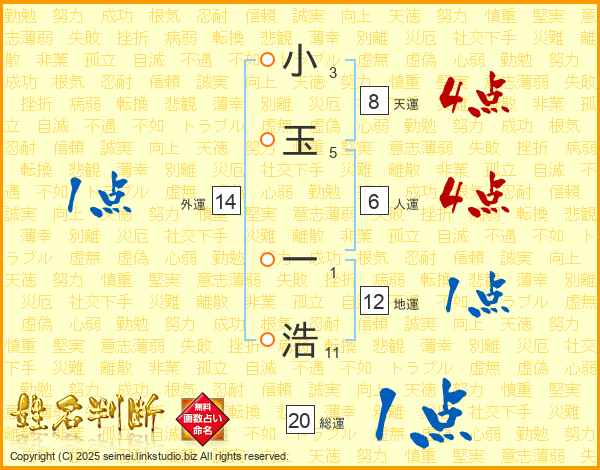 生活面を象徴する運勢です。外部から受ける影響力を表し、結婚運、家庭運や職場、環境への順応性を表します。総運から人運を引いた画数。姓や名が1文字の場合を除く。