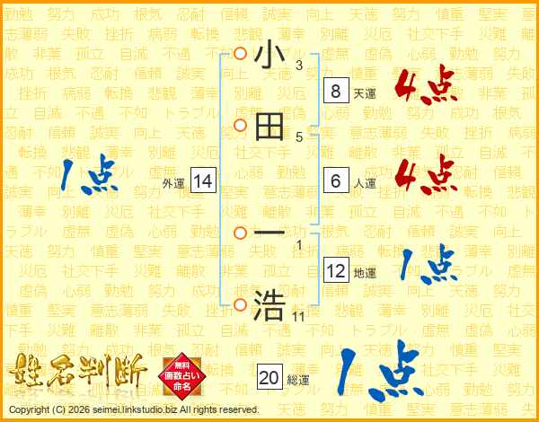 生活面を象徴する運勢です。外部から受ける影響力を表し、結婚運、家庭運や職場、環境への順応性を表します。総運から人運を引いた画数。姓や名が1文字の場合を除く。