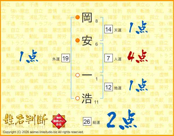 生活面を象徴する運勢です。外部から受ける影響力を表し、結婚運、家庭運や職場、環境への順応性を表します。総運から人運を引いた画数。姓や名が1文字の場合を除く。