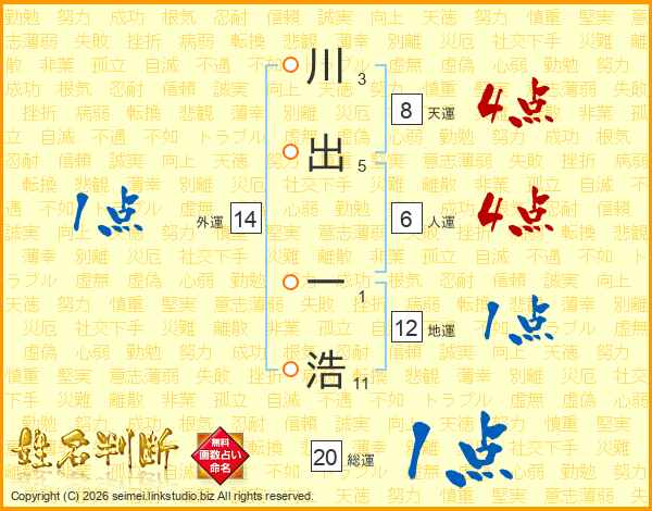 生活面を象徴する運勢です。外部から受ける影響力を表し、結婚運、家庭運や職場、環境への順応性を表します。総運から人運を引いた画数。姓や名が1文字の場合を除く。