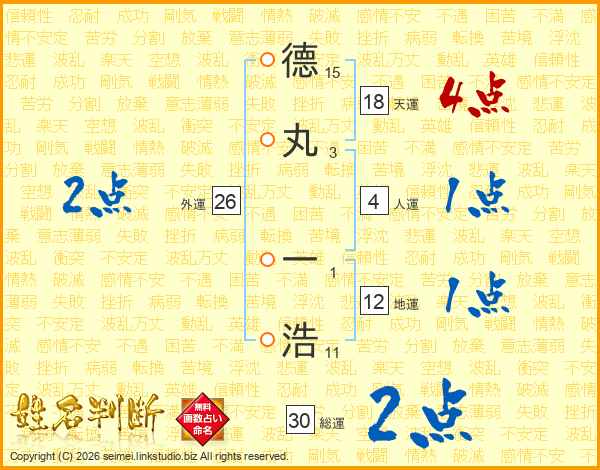 あなたの人生を表す1番重要な運勢です。生涯を通じて影響する総合運となり、主に50歳以降の晩年期に影響を及ぼします。苗字と名前の合計画数。
