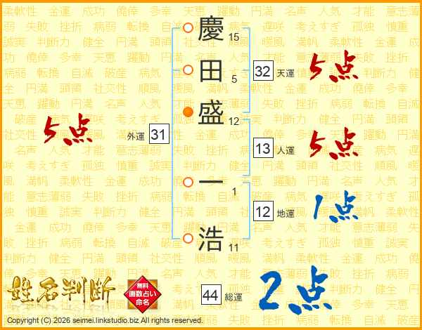 慶(15画)田(5画)盛(12画) 一(1画)浩(11画)