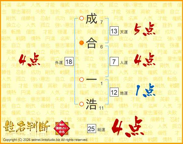 あなたの人生を表す1番重要な運勢です。生涯を通じて影響する総合運となり、主に50歳以降の晩年期に影響を及ぼします。苗字と名前の合計画数。