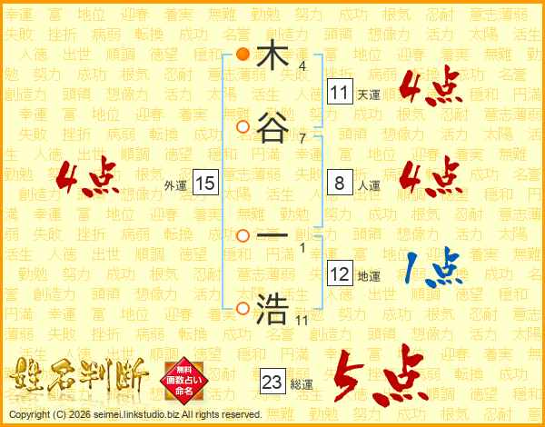 あなたの人生を表す1番重要な運勢です。生涯を通じて影響する総合運となり、主に50歳以降の晩年期に影響を及ぼします。苗字と名前の合計画数。
