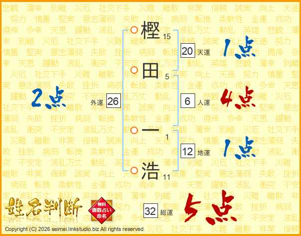 樫(15画)田(5画) 一(1画)浩(11画)