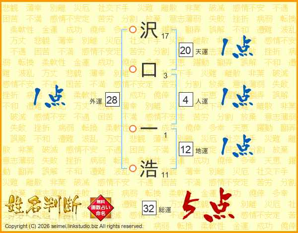 沢(17画)口(3画) 一(1画)浩(11画)