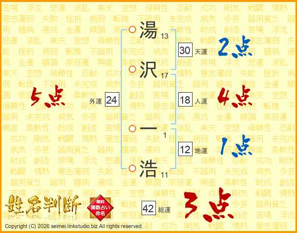 湯(13画)沢(17画) 一(1画)浩(11画)