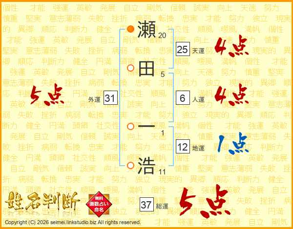 瀬(20画)田(5画) 一(1画)浩(11画)
