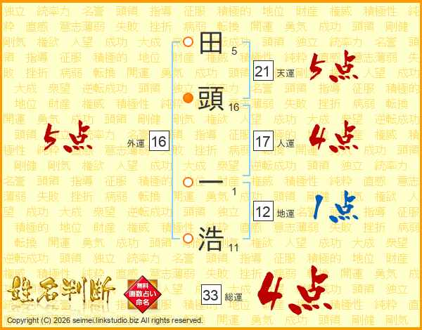 あなたの人生を表す1番重要な運勢です。生涯を通じて影響する総合運となり、主に50歳以降の晩年期に影響を及ぼします。苗字と名前の合計画数。