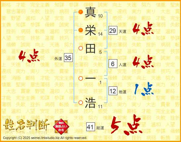 真(10画)栄(14画)田(5画) 一(1画)浩(11画)