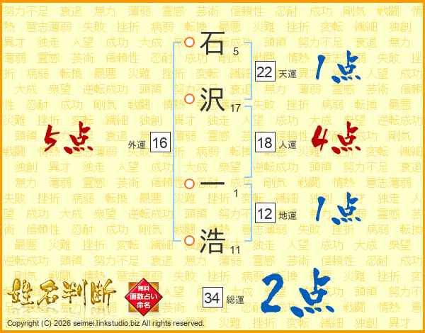 あなたの人生を表す1番重要な運勢です。生涯を通じて影響する総合運となり、主に50歳以降の晩年期に影響を及ぼします。苗字と名前の合計画数。