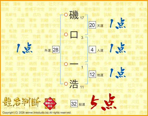 生活面を象徴する運勢です。外部から受ける影響力を表し、結婚運、家庭運や職場、環境への順応性を表します。総運から人運を引いた画数。姓や名が1文字の場合を除く。