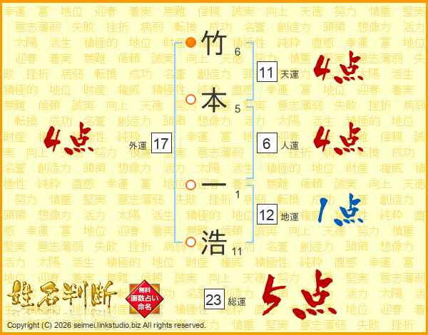 あなたの人生を表す1番重要な運勢です。生涯を通じて影響する総合運となり、主に50歳以降の晩年期に影響を及ぼします。苗字と名前の合計画数。