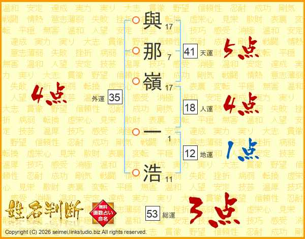 與(17画)那(7画)嶺(17画) 一(1画)浩(11画)