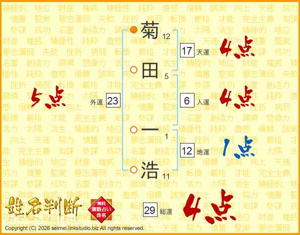 菊(12画)田(5画) 一(1画)浩(11画)