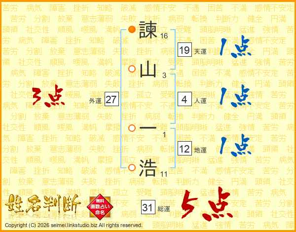 あなたの人生を表す1番重要な運勢です。生涯を通じて影響する総合運となり、主に50歳以降の晩年期に影響を及ぼします。苗字と名前の合計画数。
