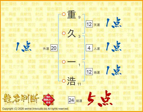 あなたの人生を表す1番重要な運勢です。生涯を通じて影響する総合運となり、主に50歳以降の晩年期に影響を及ぼします。苗字と名前の合計画数。