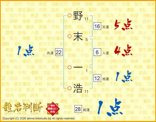 あなたの人生を表す1番重要な運勢です。生涯を通じて影響する総合運となり、主に50歳以降の晩年期に影響を及ぼします。苗字と名前の合計画数。