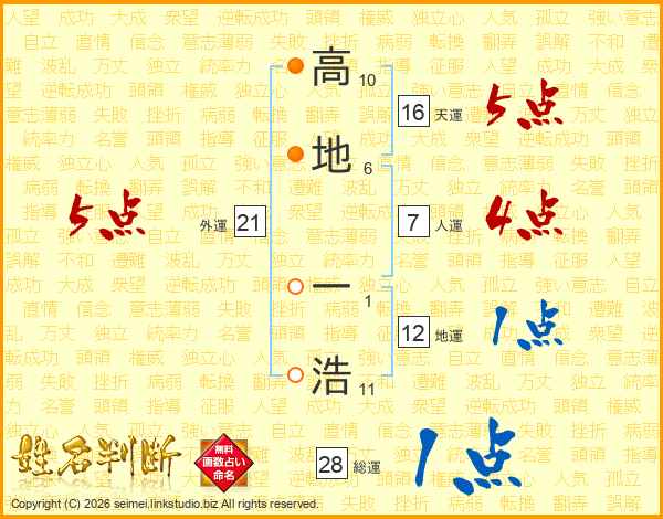 あなたの人生を表す1番重要な運勢です。生涯を通じて影響する総合運となり、主に50歳以降の晩年期に影響を及ぼします。苗字と名前の合計画数。