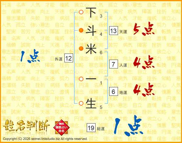生活面を象徴する運勢です。外部から受ける影響力を表し、結婚運、家庭運や職場、環境への順応性を表します。総運から人運を引いた画数。姓や名が1文字の場合を除く。