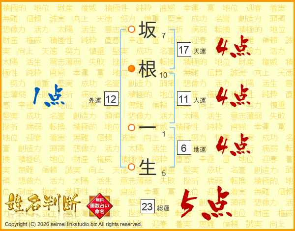 あなたの人生を表す1番重要な運勢です。生涯を通じて影響する総合運となり、主に50歳以降の晩年期に影響を及ぼします。苗字と名前の合計画数。