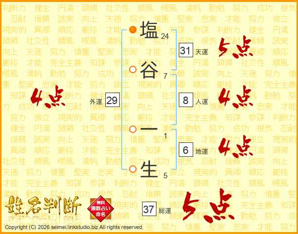 塩谷一生さんの総運は37画の5点!