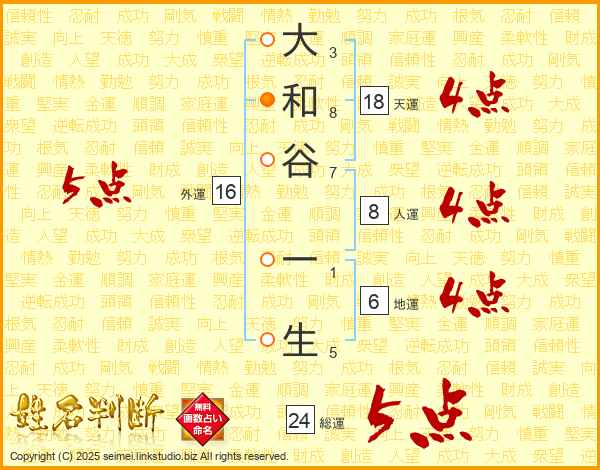 あなたの人生を表す1番重要な運勢です。生涯を通じて影響する総合運となり、主に50歳以降の晩年期に影響を及ぼします。苗字と名前の合計画数。
