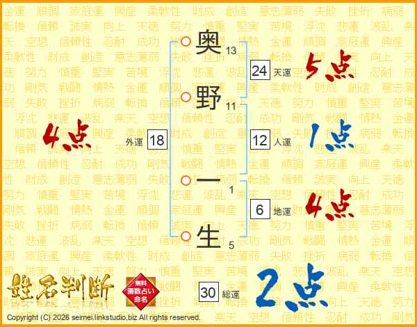 奥野一生さんの外運は18画の4点!