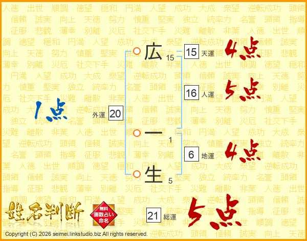 生活面を象徴する運勢です。外部から受ける影響力を表し、結婚運、家庭運や職場、環境への順応性を表します。総運から人運を引いた画数。姓や名が1文字の場合を除く。