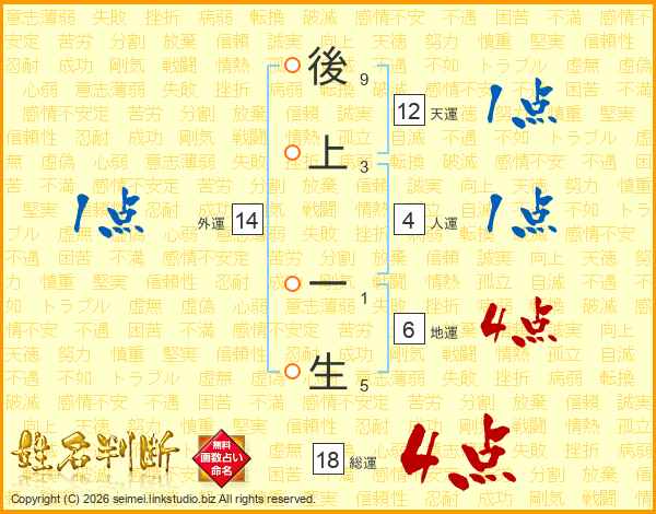 生活面を象徴する運勢です。外部から受ける影響力を表し、結婚運、家庭運や職場、環境への順応性を表します。総運から人運を引いた画数。姓や名が1文字の場合を除く。