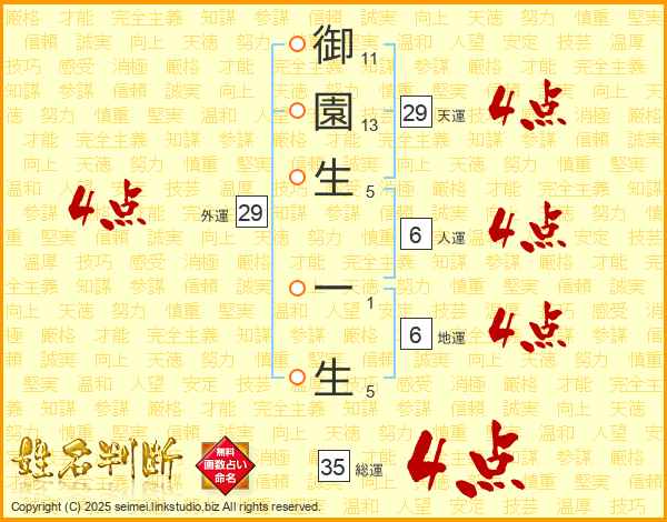 御(11画)園(13画)生(5画) 一(1画)生(5画)