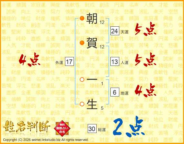 朝賀一生さんの総運は30画の2点!