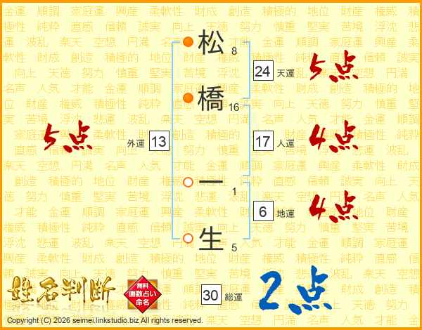 あなたの人生を表す1番重要な運勢です。生涯を通じて影響する総合運となり、主に50歳以降の晩年期に影響を及ぼします。苗字と名前の合計画数。