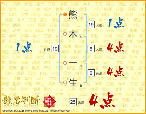 熊本一生さんの総運は25画の4点!