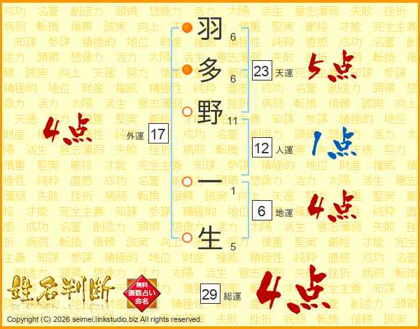 羽多野一生さんの総運は29画の4点!
