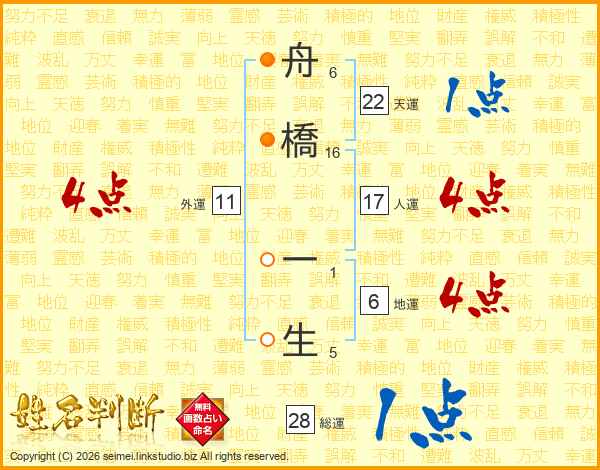 生活面を象徴する運勢です。外部から受ける影響力を表し、結婚運、家庭運や職場、環境への順応性を表します。総運から人運を引いた画数。姓や名が1文字の場合を除く。