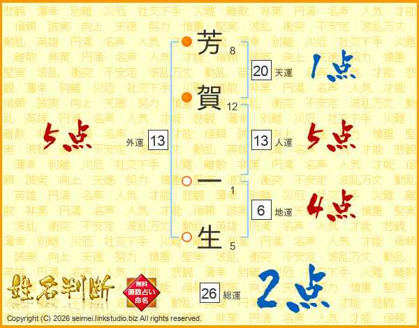 生活面を象徴する運勢です。外部から受ける影響力を表し、結婚運、家庭運や職場、環境への順応性を表します。総運から人運を引いた画数。姓や名が1文字の場合を除く。