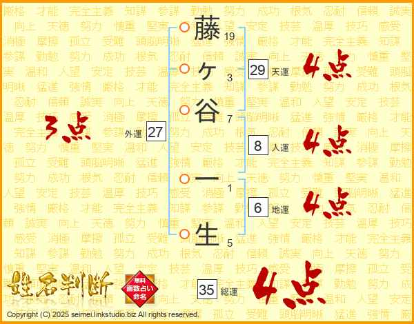 藤(19画)ヶ(3画)谷(7画) 一(1画)生(5画)
