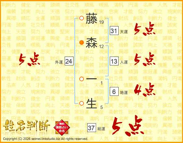 あなたの人生を表す1番重要な運勢です。生涯を通じて影響する総合運となり、主に50歳以降の晩年期に影響を及ぼします。苗字と名前の合計画数。